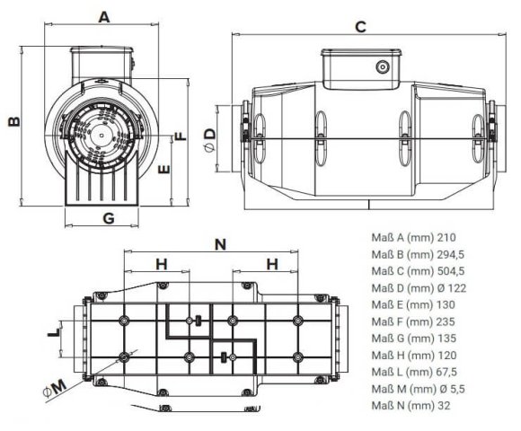 Der Ventilator verfügt über einen robusten Kugellager-AC-Motor mit Überhitzungsschutz und lässt sich horizontal oder vertikal installieren. Die Ventilatoreinheit ist einfach entnehmbar – ideal zur schnellen Reinigung und Wartung ohne Demontage der Rohrleitung.