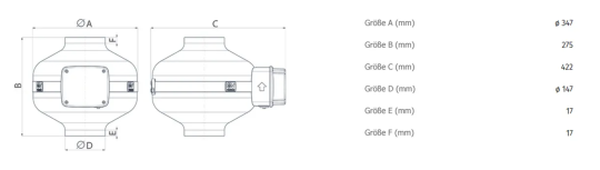 Mit seiner Nennweite von 150 mm lässt sich der Rohrventilator unkompliziert in bestehende Rundrohrsysteme integrieren. Die kompakte Bauform ermöglicht eine platzsparende Installation, sowohl horizontal als auch vertikal.