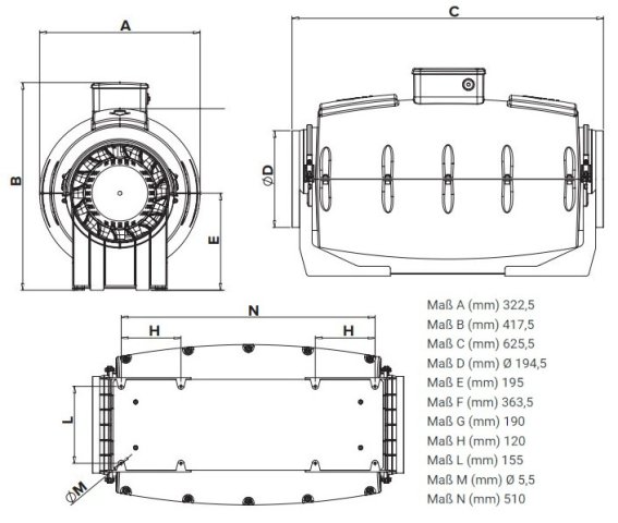 Der Ventilator verfügt über einen robusten Kugellager-AC-Motor mit Überhitzungsschutz und lässt sich horizontal oder vertikal installieren. Die Ventilatoreinheit ist einfach entnehmbar – ideal zur schnellen Reinigung und Wartung ohne Demontage der Rohrleitung.