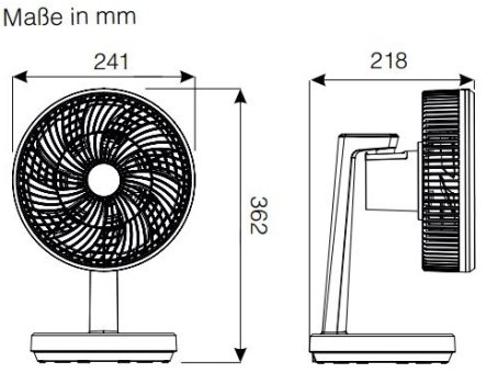 Gehäuse und Gitter ABS weiß, Flügel grau, Korb Ø 241 mm, Flügel Ø 200 mm, Motor 14 Watt, 220-240 Volt ~ 50-60 Hz, Drehzahl max. 1.210 U/min, 4 Stufen per Soft-Tastschalter mit LED-Anzeige, 2-stufige, elektronische Oszillation (45° und 70°), stabiler Standfuß.